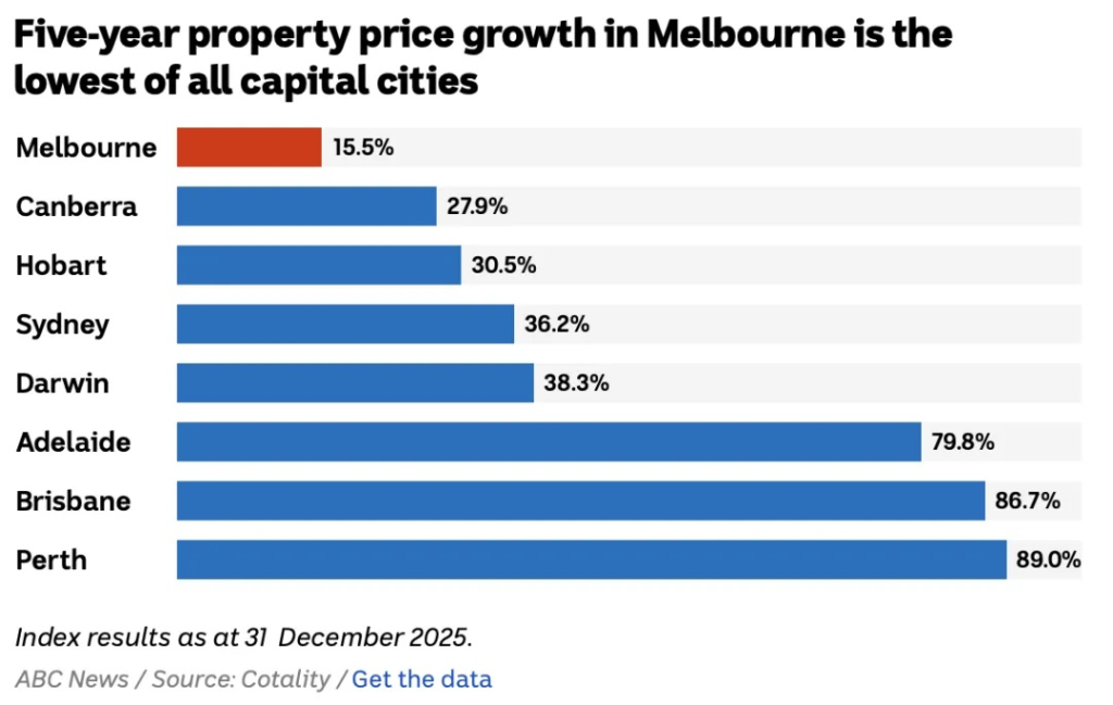 墨爾本的住房價格在過去五年裏僅上漲了15.5%。遠低於布裏斯班、阿德萊德和珀斯近80%至90%的漲幅。去年12月,全澳房價平均上漲0.7%,但其中悉尼和墨爾本雙雙錄得小幅下跌。