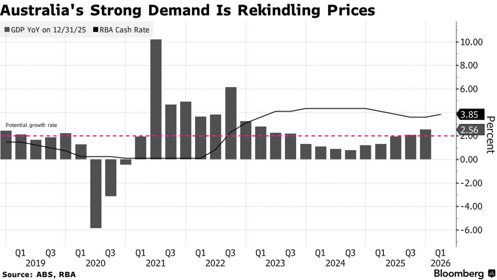 然而,這些數據勾勒出的樂觀圖景,正與央行關鍵時刻的抉擇形成張力。澳大利亞儲備銀行(RBA)於2月成為發達國家中首個收緊貨幣政策的主要央行,將現金利率上調25個基點至3.85%,以應對頑固的通脹壓力。RBA當時警告稱,進壹步加息是壹個“迫在眉睫”的可能性。