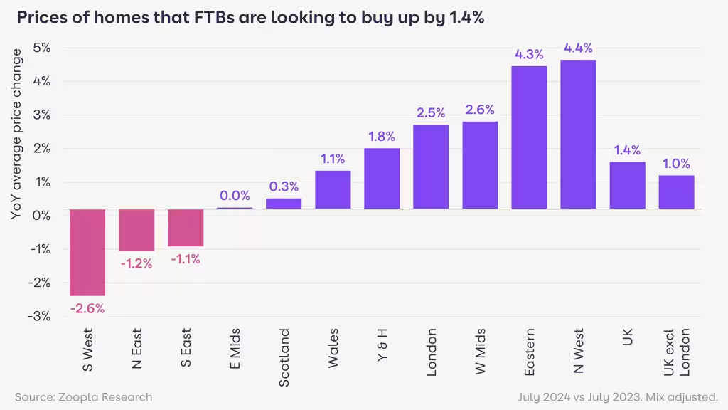 自 2023 年 7 月以來,FTB 想要購買的房屋價格在英格蘭西北部(+4.4%)和東部(+4.3%)漲幅最大。