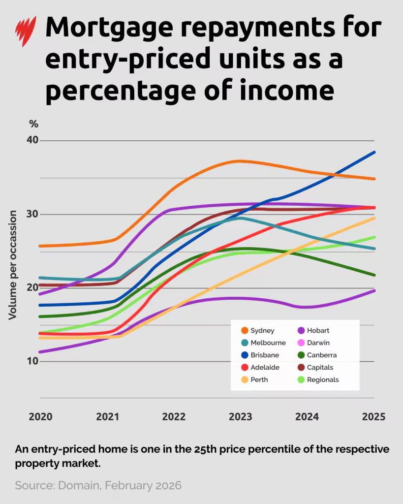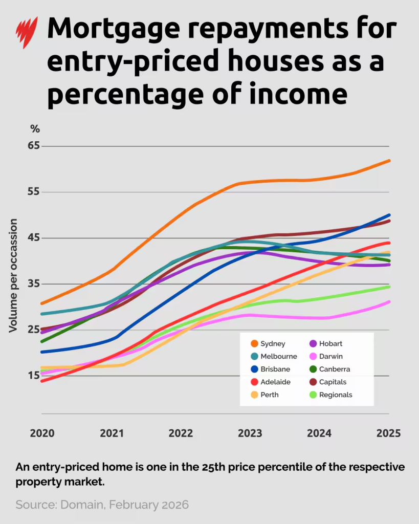 Domain的研究顯示過去五年中,入門級住房的價值隨著通脹穩步上升,而工資增長滯後,導致澳洲人將更多收入用於房貸。