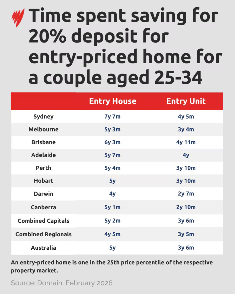 根據Domain周四早間發布的最新研究,壹對夫婦積攢20%首付所需的時間,從達爾文入門級公寓的2年7個月到悉尼入門級住房的7年7個月不等。對於試圖邁出置業第壹步的單薪家庭來說,這些等待時間可能會翻倍。