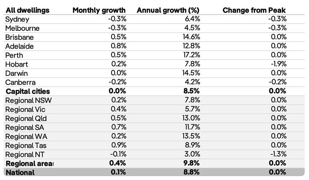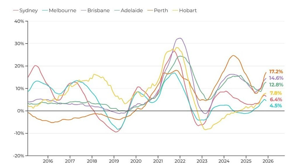 而12月的月度數據更凸顯市場分化:布裏斯班與珀斯房價環比均上漲0.5%,悉尼、墨爾本則雙雙下跌0.3%,阿德萊得以0.8%的環比漲幅領跑當月各首府城市,達爾文持平,堪培拉下跌0.2%。