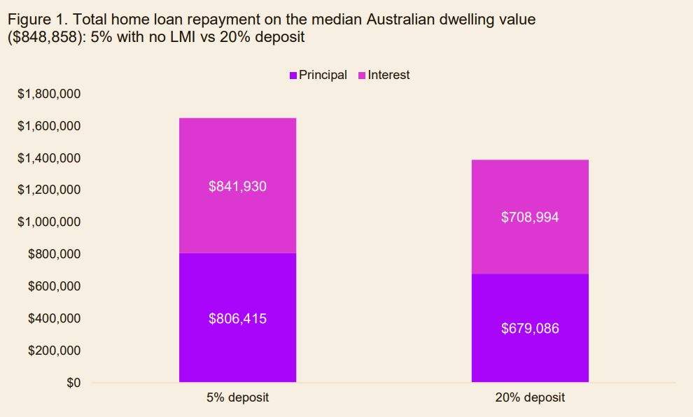 與傳統的 20% 存款相比,承擔額外的債務意味著支付額外的利息(圖 1 顯示了基於澳洲平均住宅價值的說明性範例)。