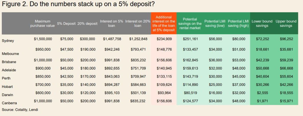 圖2比較了5%貸款的額外利息成本與潛在的LMI和租金節省。在這種情況下,選擇最高利率購屋比在租賃市場上多花些時間攢20%的首付更划算。