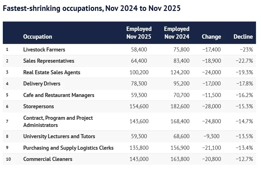 從長期來看,壹些需要人與人互動的職業被認為更有增長空間,比如教師、技工、養老護理和醫療相關崗位。但現實中,清潔工和餐飲服務人員——這些同樣被預測會增長的崗位——卻在最近壹年成為澳洲縮減最快的職業之壹