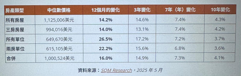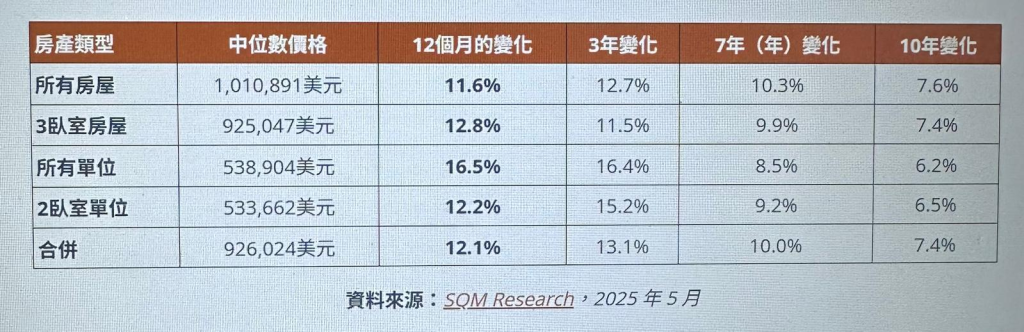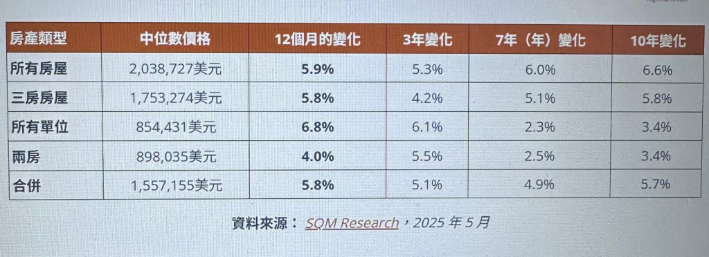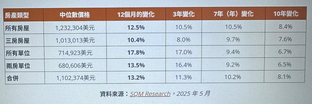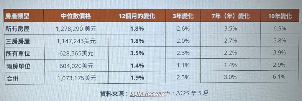 | 房產類型 | 中位數價格 | 12個月的變化 | 3年變化 | 7年(年)變化 | 10年變化 |