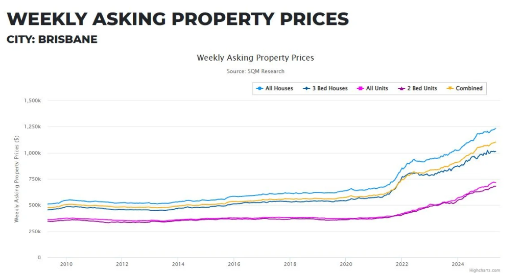 如下圖所示,布里斯本房價的大部分成長發生在 2021 年疫情期間的房地產市場繁榮時期,從 2023 年底至今,房價再次飆升。
