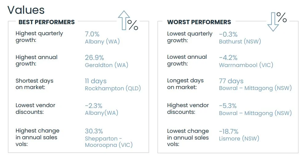 西澳在季度成長排行榜上佔據主導地位,奧爾巴尼的房價上漲了 7.0%,傑拉爾頓的房價上漲了 1.5%。