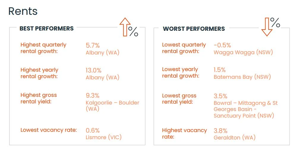 西澳大利亞的奧爾巴尼在本季的租金漲幅最大,達 5.7%,其次是伯尼-薩默塞特 (THS,4.4%) 和塔里 (NSVV,3.9%)。