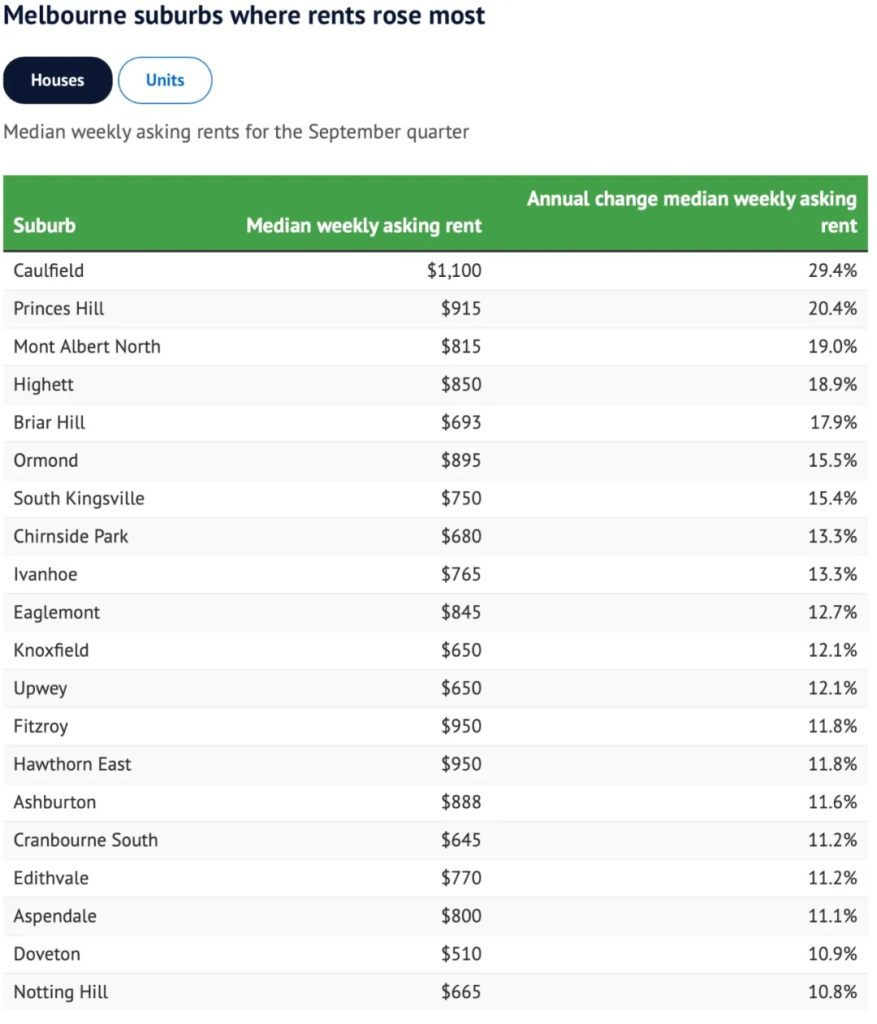 根據Domain發布的最新租金報告:截至9月季度,Caulfield的獨立屋周租金飆升29.4%,達到1100澳元,漲幅居全市之首;緊隨其後的是Princes Hill,上漲20.4%至915澳元。