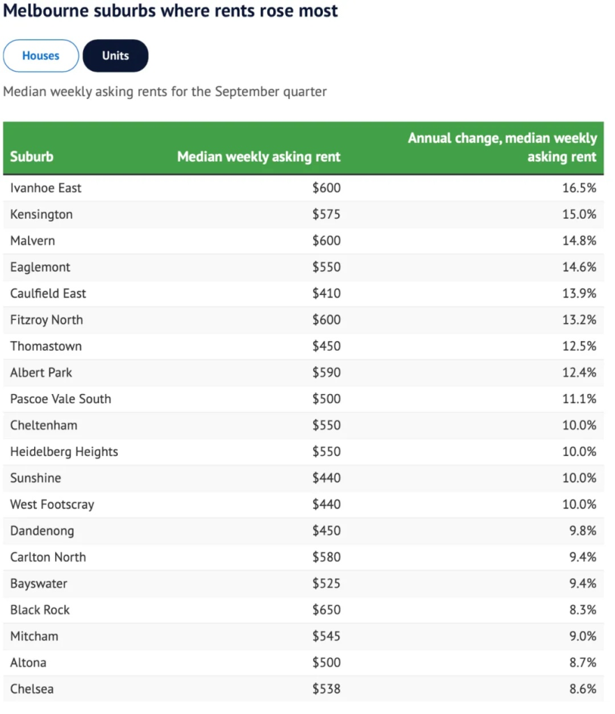 盡管整體租金漲勢已趨平緩,但在過去壹年裏,墨爾本仍有數十個城區的租金出現了雙位數的飆漲,尤其是壹些高端熱門區域。