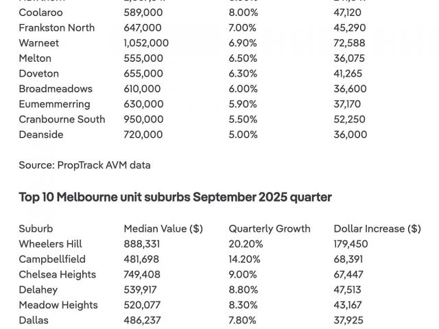 其他表現亮眼的區域包括Wheelers Hill,其公寓價值漲幅達20.2%;Campbellfield和Chelsea Heights的季度漲幅均接近9%。