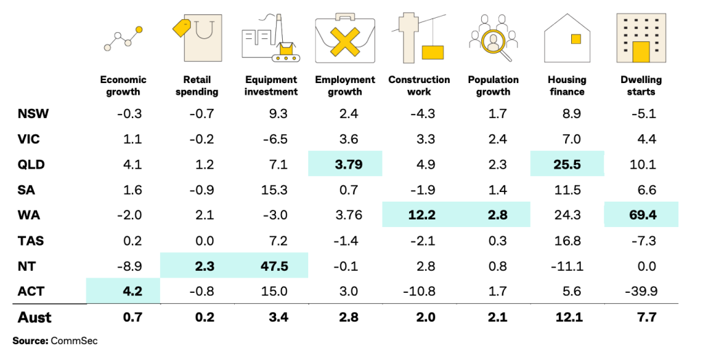 CommSec 的《各州狀況報告》對澳洲各地的經濟表現進行了評估,並顯示從總體上看,以資源為主的昆士蘭州和西澳大利亞州均擁有最強勁的年度經濟增長勢頭,這得益於強勁的房地產市場和穩定的人口增長。