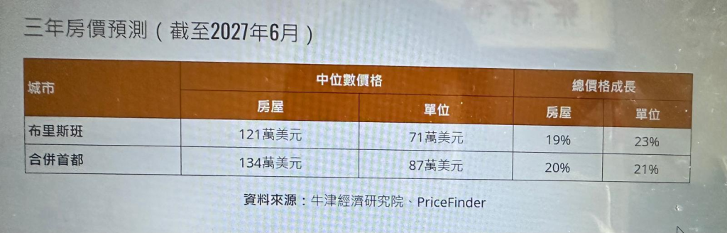 牛津經濟研究院最近對布里斯班房價三年後走勢做出了以下預測。