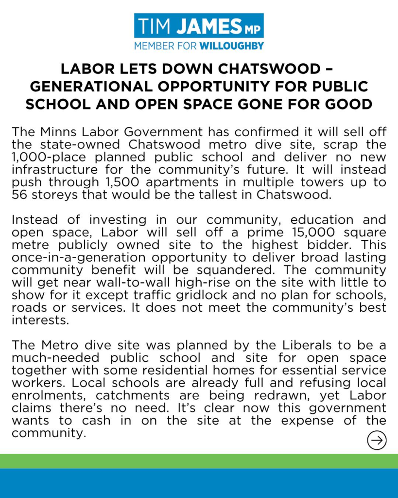 Willoughby自由黨議員 Tim James批評說:“工黨並沒有投資社區、教育和開放空間,而是把這塊 1.5 萬平方米的黃金公有地賣給出價最高者。這是壹次世代難遇的機會,卻被浪費了。社區得到的,只會是墻到墻的高樓,卻沒有學校、道路和服務,帶來的是交通癱瘓與混亂。這不符合社區的最佳利益。”