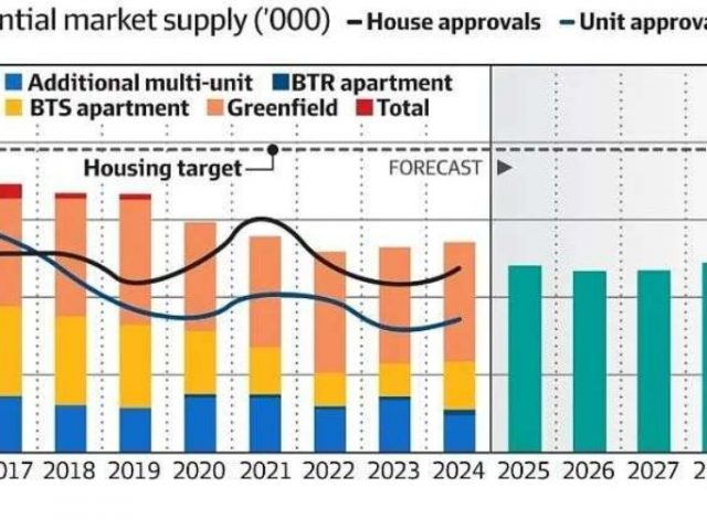 2年前,聯邦政府和州政府達成了壹項協議,即從2024年中期開始的5年內新建120 萬套房,該協議被稱為國家住房協議(National Housing Accord)。 但最新預測顯示,無論是綠地住宅還是公寓的開工率都大幅放緩,低於平均水平。