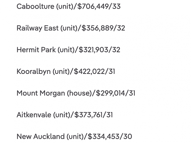 Rosslea的公寓漲幅居首,上漲34%,中位價達35.6萬澳元;其次是Caboolture(上漲33%,中位價70.6萬澳元)、Railway East(上漲32%,中位價35.6萬澳元)、Hermit Park(上漲32%,中位價32.1萬澳元)和Kooralbyn(上漲31%,中位價42.2萬澳元)。