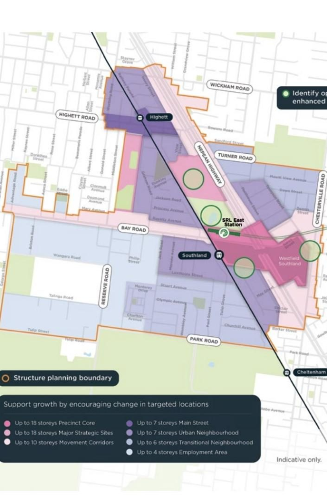 Cheltenham站的規劃(包括Southland和Highett站)顯示,Nepean Highway沿線至少兩個地點的最高建築限高將提升至60米(18層)。在Highett至Cheltenham的鐵路走廊沿線,公寓樓高度將在21米至33米之間。
